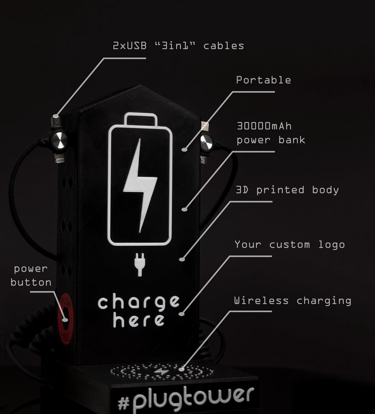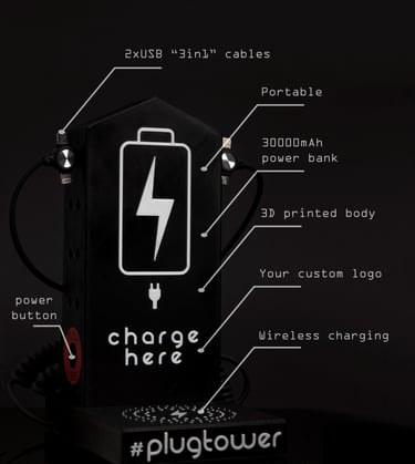 If you are the owner of a bar or restaurant, your customers will be happy because they will be able to have a delicious coffee or a meal and they will not have to worry about recharging their equipment. We also offer to put your company logo, menu, or even the best offers of the day on the front of the Plug Tower. This device will also serve as a great marketing tool. We will adapt it to your needs.